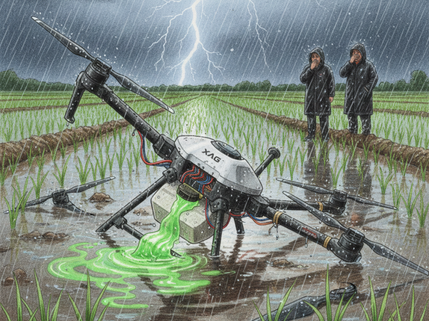 事件经过:2025年4月,山东青岛黄岛,一台极飞P100农业无人机在植保作业时突遇雷阵雨,电子元件短路失控坠田;