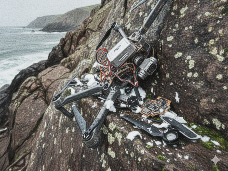 事件经过:2025年7月,新疆阿勒泰,一台大疆Mavic 3 Classic无人机在户外航拍时遭遇强阵风,无人机失控撞向岩壁坠毁;