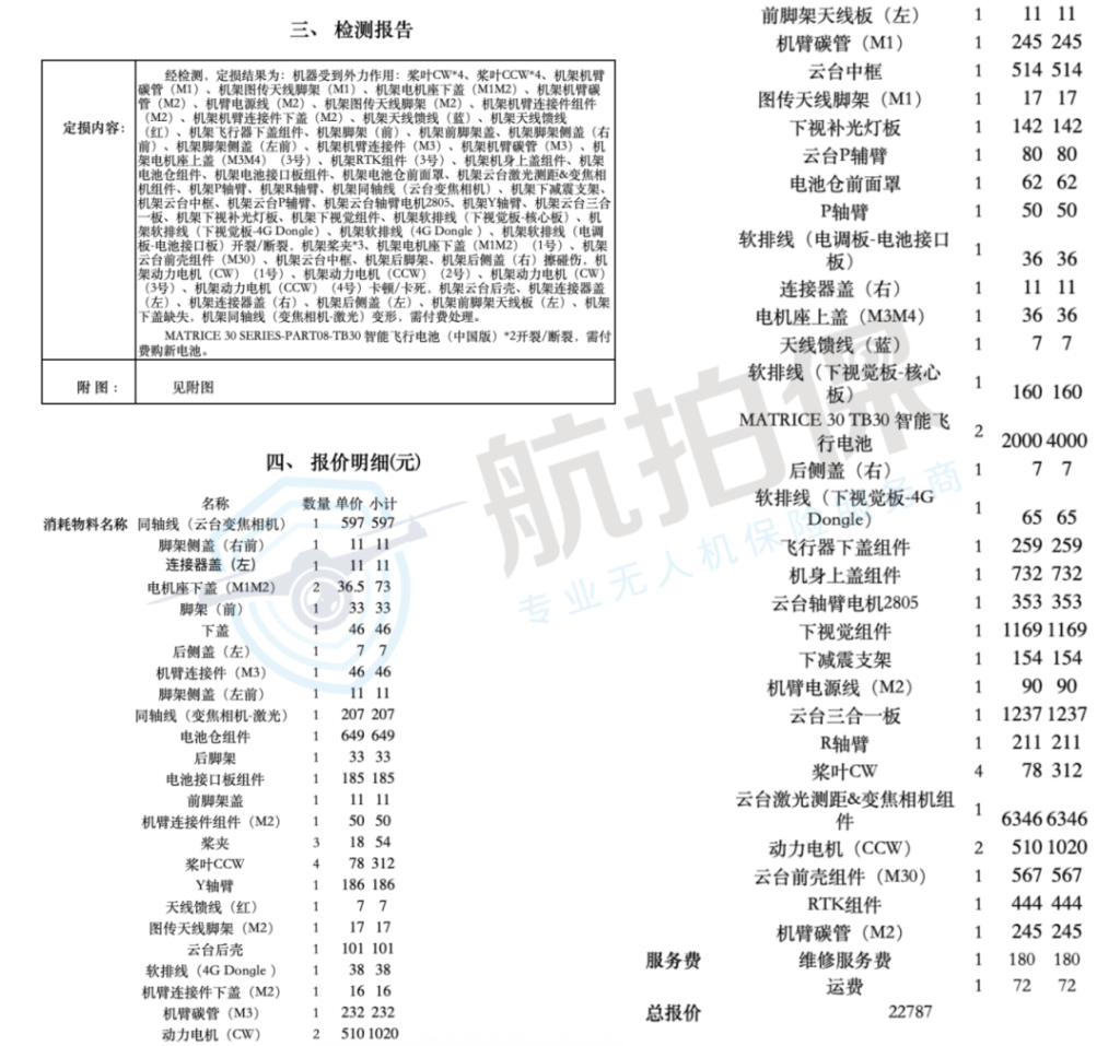 客户报案后理赔专员立即协助客户将无人机送往【航拍保】合作维修点进行维修检测,检测定损结果为:因外力作用,无人机损坏过多,无人机维修总费用22787元!